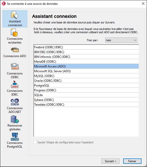 Cliquez sur la commande Requête base de données pour commencer à créer une connexion. Le dialogue Se connecter à une source de données (capture d’écran ci-dessous) apparaît. Sélectionnez le type BD que vous souhaitez et suivez les instructions de l’assistant.