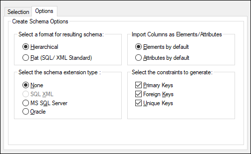 Dans l’onglet Options (voir la capture d’écran ci-dessous), vous pouvez spécifier le format du schéma, son type d’extension, si les colonnes doivent être importées comme éléments ou attributs et les contraintes de base de données qui devraient être générées dans le schéma.