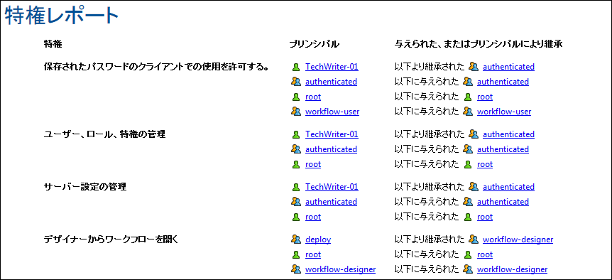 ユーザーレポートの特権 (下部スクリーンショット) には各ユーザーロールが特権のサマリーと共にリストされています。また、継承も表示されています。