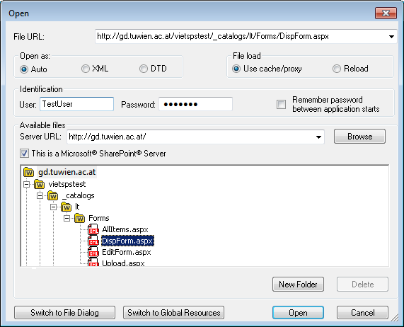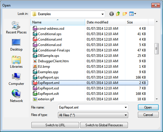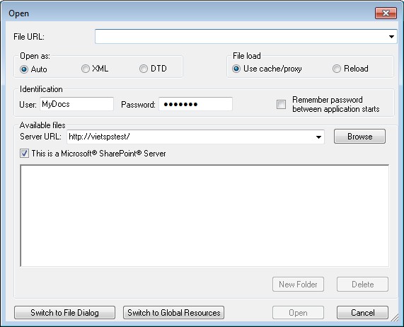 「ファイルを開く」 および 「ファイルの保存」 ダイアログでは、 URL またはグローバルリソースを使用して必要なファイルを選択またはファイルを保存することができます (下のスクリーンショット参照))。選択プロセスに移動するために 「URL に切り替える」 または 「グローバルリソース」 をクリックしてください。