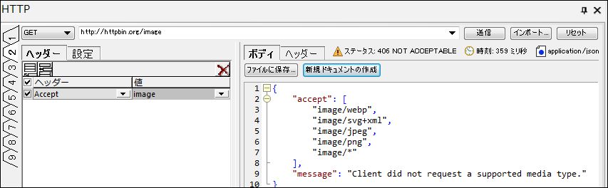 リクエストのヘッダーの受け入れは、レスポンス内で受け入れられるコンテンツの型を指定します。例えば、 Accept=image (下の最初のスクリーンショット) と Accept=image/png (下の2番目のスクリーンショット)の違いを確認してください。最初の場合、レスポンスに送信されるイメージの書式が指定されていないため、エラーの状態コードと詳細を含む JSON メッセージが送信されます。