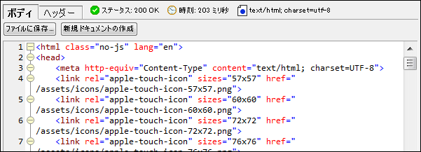 •ボディタブ: ドキュメントが HTML, XML, or JSON の場合、レスポンスのボディが構文色分けと行番号を用いて表示されます。タブには2つのボタンがあります: (i) ファイルにボディを保存する「ファイルに保存する」。 (ii) XMLSpy 内で新規ドキュメントを表示する 「新規ドキュメントを作成する」 と GUI のマインウィンドウ内で新規に作成されたドキュメントが表示されます。新規に作成されたドキュメントは通常の方法で編集し、保存することができます。 レスポンスのボディからレスポンスを作成することの出来ない場合、 (例えばボディがイメージの場合など)「新規ドキュメントを作成する」 ボタンが表示されます (スクリーンショットを参照 )。