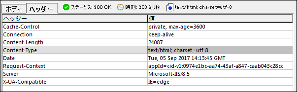 •ヘッダータブ: レスポンスのヘッダーが含まれています。 コンテンツの型 ヘッダーはペインの上の部分に表示されます。