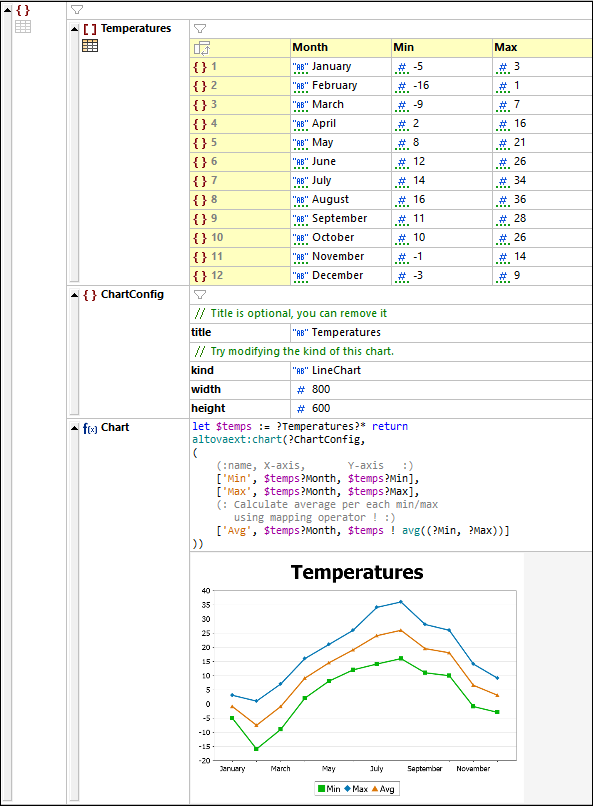 •チャートデータ系列は altovaext:chart の2番目の引数です。各データ系列はサイズ3の配列です: (I) 系列の名前 (ii) x-軸の値 (ii) y-軸の値(例えば、上のサンプルのように各系列がラインを表示する場合など) 複数の系列を作成する場合は複数の配列のシーケンスを作成します。上のサンプルには最低、最高、および平均機能のための3個のデータ系列が存在します。X と Y 軸のためのデータは Temperatures という名前の配列から参照されます。
