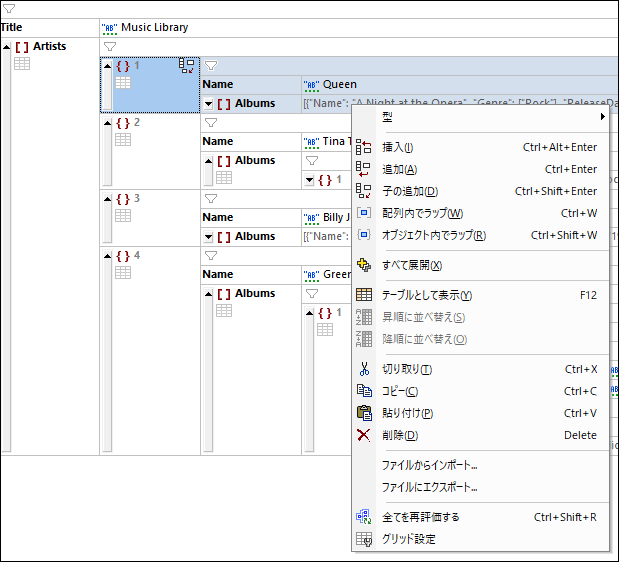 配列内: リストまたはテーブルに配列アイテムをふかします。 オブジェクト内: key:value ペア (をリスト内で、または (テーブル表示で) 新規のテーブル列のセルとして)付加します。 |