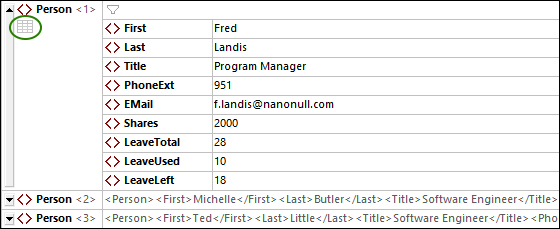 繰り返し要素は標準のグリッドビューでドキュメント順に垂直下法で順番に表示されています(左下のスクリーンショット参照)。しかしながら、繰り返し要素を テーブルの行 として表示すると追加編集機能が与えられます。下のスクリーンショットでは Person 要素は繰り返し要素です。左のスクリーンショットは標準のグリッドビューを表示しています。最初の Person 要素が展開されて表示され、続くインスタンスは折りたたまれて表示されます。右のスクリーンショットは繰り返しPerson 要素をテーブルの行として表示しています。
