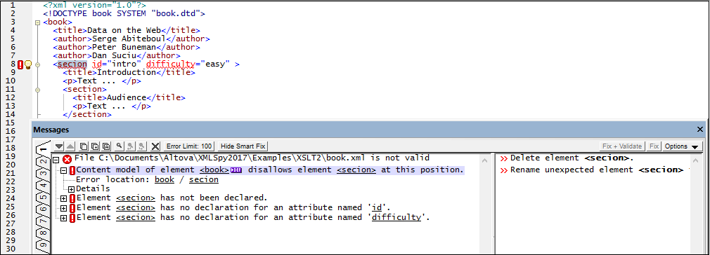 XML | 検証 (F8) コマンド は、ドキュメントを関連した DTD、XML スキーマ、または、他のスキーマに対して検証します。ドキュメントが妥当な場合、検証に成功したことを示すメッセージがメッセージウィンドウに表示されます。それ以外の場合、 左側のペイン内にエラーの原因が表示されます (下のスクリーンショットを参照してください)。左側のペインで原因が選択されている場合、使用できる場合は、右側のペインに表示されているスマートフィックスを使用します。スマートフィックスの提案は、関連付けられたスキーマ内の情報をベースにしています。スマートフィックスを適用するには以下を行います (i) ダブルクリックする、 (ii) 選択して、 フィックス または フィックス + 検証 オプションを選択します (下のスクリーンショットを参照してください)。