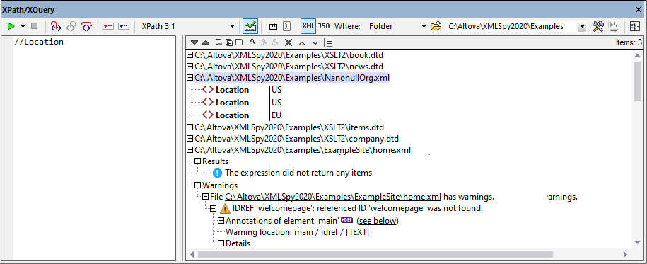 •(選択個所オプションで指定されている) 複数のファイルに対して評価が行われる場合、各ファイルの結果はそのファイルのパスの下に個別にリストされます(下のスクリーンショットを参照)。I評価モードが XML の場合、XML-適合ファイルは評価され、他の型はスキップされます。 評価モードが JSON の場合、JSON-適合ファイルが評価され、他の型はスキップされます。
