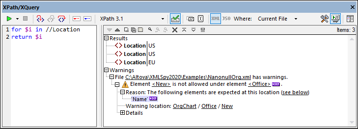 XML ファイルと XPath 式のロケーションを表示します。 |