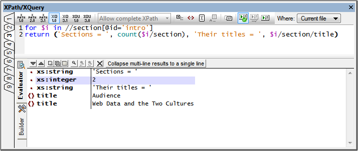 上のスクリーンショット内で、属性 @id='intro'を持つセクション要素のためにクエリが作成されます。 クエリは、この intro セクション サブ-セクションの数量とタイトルを返します。