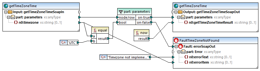 For an example of a mapping which contains a web service fault, open the following sample MapForce project: <Documents>\Altova\MapForce2026\MapForceExamples\TimeService\TimeService.mfp. Double-click the mapping (operation) getTimeZoneTime.mfd.