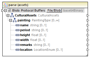 •Parse Blobs to Protocol Buffers - This command turns the component into a parsing component. This helps you parse a binary value in Protocol Buffers format so that it becomes a mappable tree structure. This works in a similar way to string parsing and serialization (see Parsing and Serializing Strings), only in this case it works not with character strings but with binary byte strings. For example, in the component below, you can connect an item of binary type to the "Blob" input on the left side. At mapping runtime, this binary value will be parsed and it will pass data onto the outputs of the mappable structure on the right side.