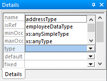6.With this element still selected, in the Details entry helper, select addressType from the type drop-down list. The type "addressType" is in blue because it is on the SchemaAgent search path.
