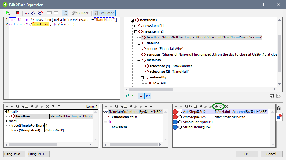 Variables that have been declared in the expression and that are in scope in the current evaluation step will be displayed together with their respective current values. For example, in the screenshot above, processing has been paused at the breakpoint on headline. The $i variable is in scope at this evaluation step. So $i is displayed with its current value, which in the screenshot above is the first newsitem node.