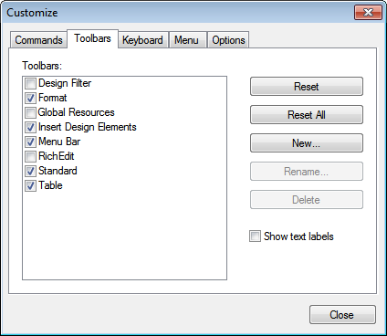 In the Toolbars tab of the Customize dialog, you can toggle a toolbar on and off by clicking in its checkbox. When a toolbar is selected (in the Toolbars tab), you can cause the text labels of that toolbar's items to be displayed by clicking the Show text labels check box. You can also reset a selected toolbar to the state it was in when StyleVision was installed by clicking the Reset button. You can reset all toolbars and the menu bar by clicking the Reset All button.