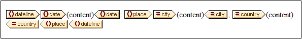 Notice that in the output of the dateline element, the contents of the date element and place/@city and place/@country attributes are run together without spacing. You can add the spacing as static text. In the design, place the cursor after the date element and enter a colon and a space. Next, enter a comma and space after the @city attribute (screenshot below)