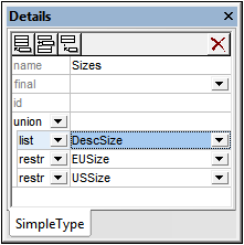 You can use the Details entry helper to quickly and accurately create derived simple types: restriction, list, and union. When a simple type is selected in the design, the Details entry helper will have a Simple Type tab in it (see screenshot below).