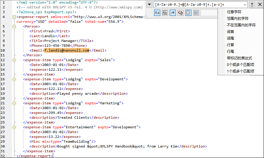 您可以使用正则表达式(regex)来查找文本字符串。为此,请先启用正则表达式选项(请参见上方查找选项)。这表明搜索字段中的文本将作为正则表达式进行评估。然后,在搜索字段中输入正则表达式。如需构建正则表达式的帮助,单击位于搜索字段右侧的正则表达式生成器按钮(请参见下方截图)。单击生成器中的条目以在搜索字段中输入相应的正则表达式元字符。下方截图显示了一个用于查找电子邮件地址的简单正则表达式。有关元字符的简要说明,请参见下方正则表达式元字符部分。