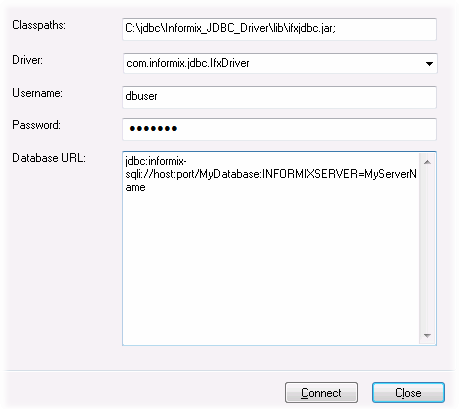 jdbc:informix-sqli://hostName:port/databaseName:INFORMIXSERVER=myserver; |